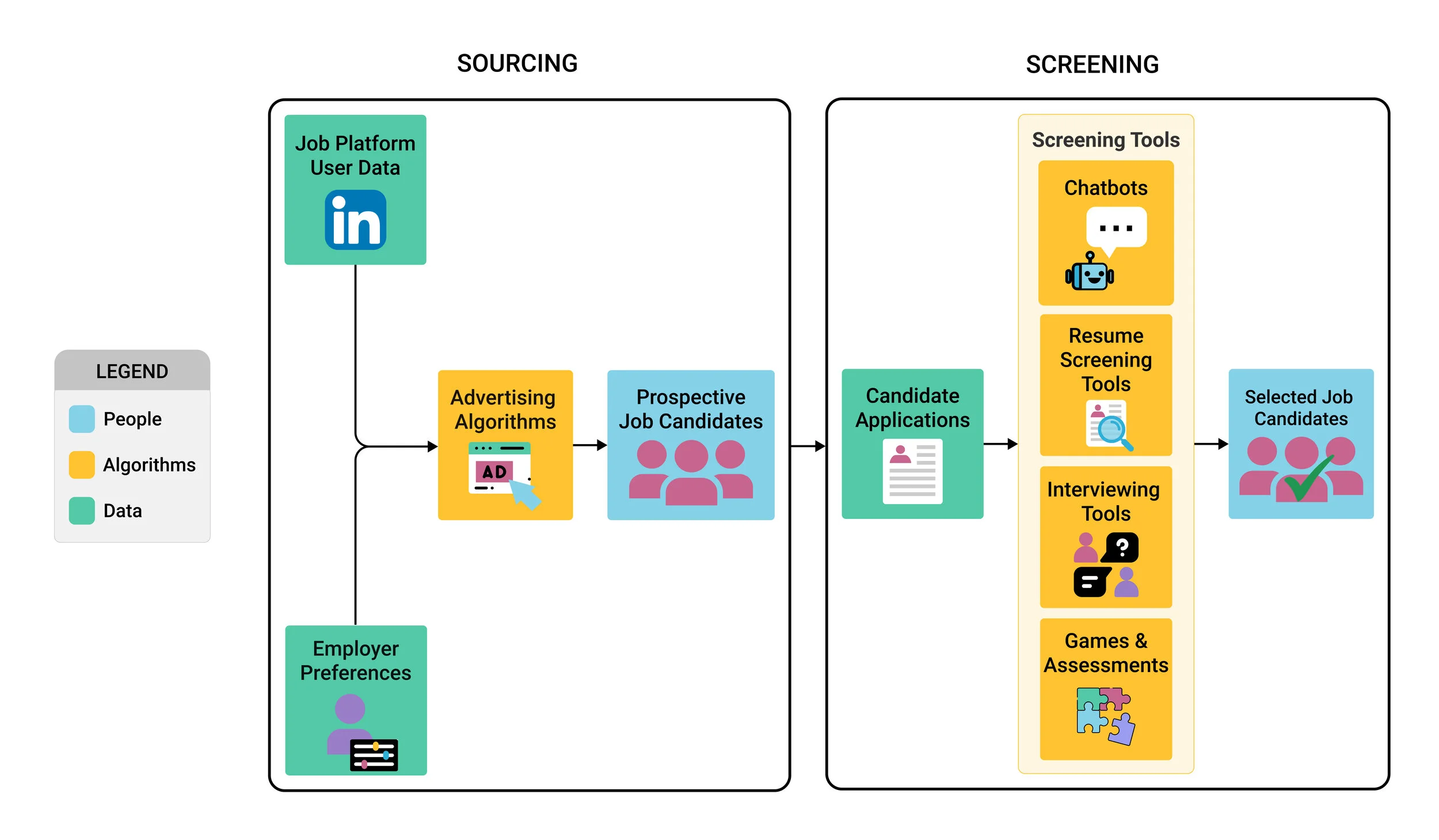 Overview: The hiring process can be broken down into two stages: sourcing and screening. During sourcing, employers often purchase targeted advertising services on social media and job platforms to market jobs to prospective candidates. During screening, employers use tools such as resume-screening technology and chatbots to evaluate candidates.